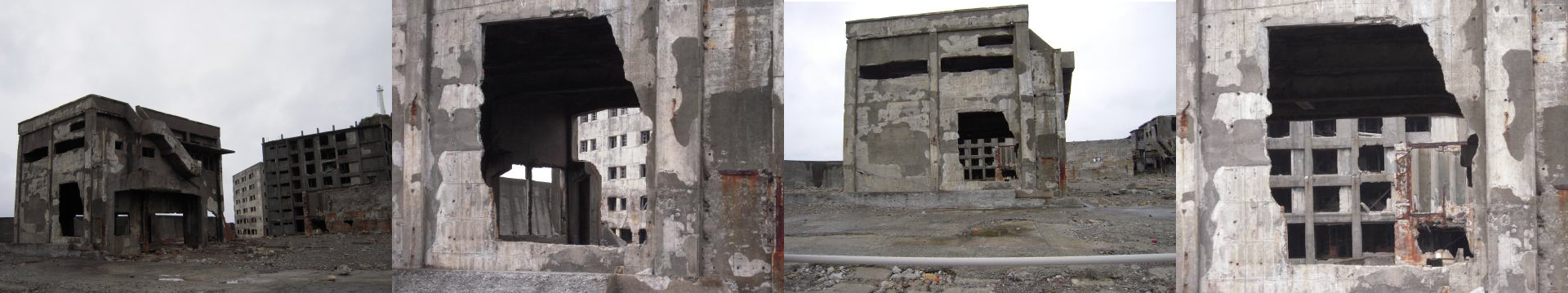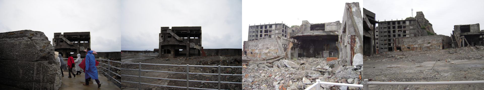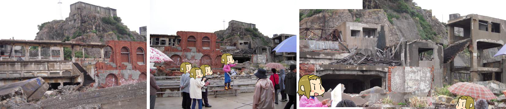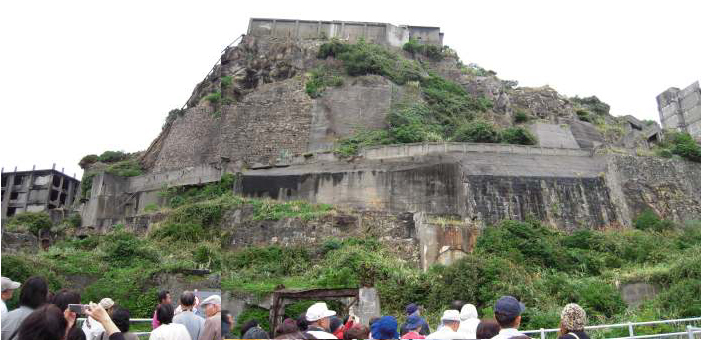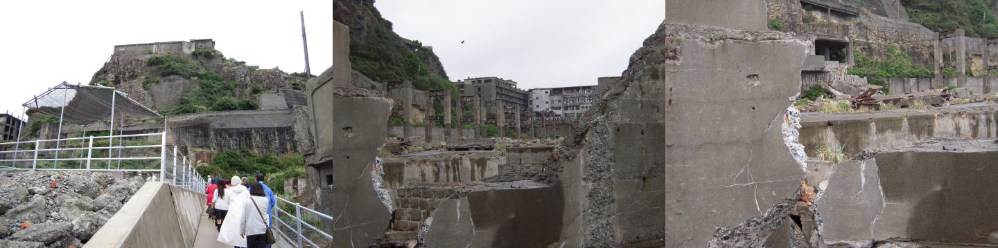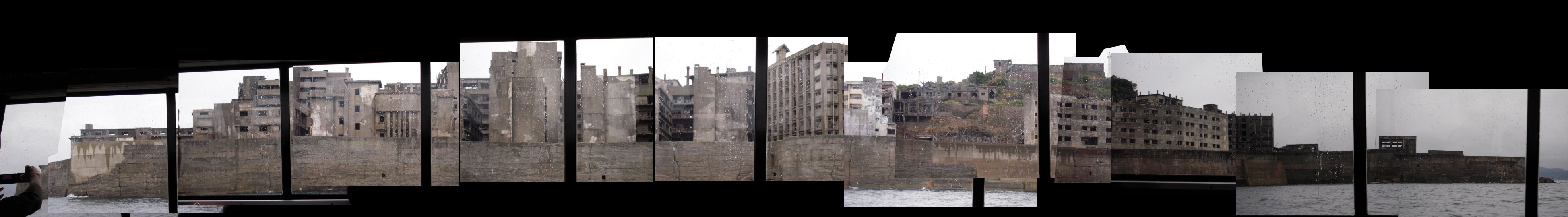 左側の一番前の席から見た島の北側。端島小中学校。7階建て。