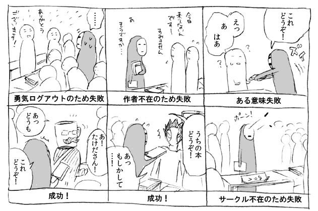 11時前頃自スペース前に戻ってくると、たけださんがいらしたところだったので反射的に本を渡してしまう。通路の真ん中で。