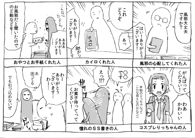 ちょこちょこお声掛けくださる方がいて、ここ見てくださってる方なんだなあ…と思って嬉しかったです。風邪はもう大丈夫でした。ありがとうございました!!