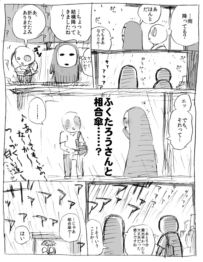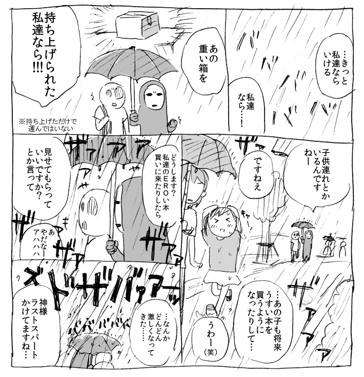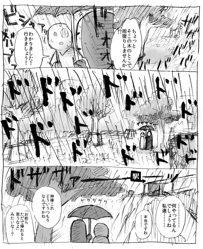 一年前の冬コミ申込みで注目する作家のところに記入して、その4ヵ月後の冬コミで本をいただいたりお話させていただいたりして、さらにその半年後一緒に本を作ったりしたかつての(今でも)憧れの人と、なんでこんな土砂降りの雨の日に、初めて来た街の木の下でボーっと相合傘なんかしてんだろ…………