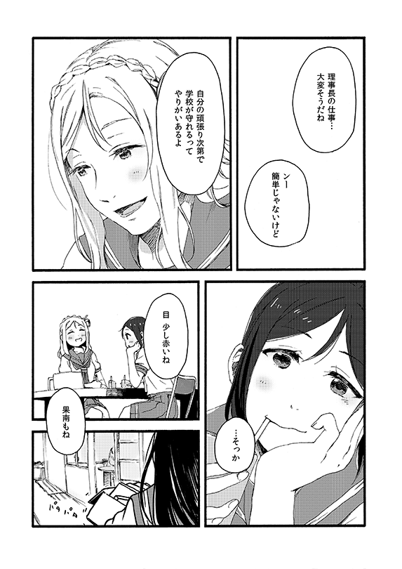 1期9話(2期まだだけど)のかなまり仲直りの翌日の3年生がこうだったらいいな~という感じのお話です。サンプルはつづきとPixivに。