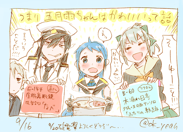 メンバーが豪華過ぎる…こんな本はもう二度とお目にかかれないかもしれないので、ゆうさみ好きの方、五月雨ちゃん好きの方、夕張さん好きの方は是非とも何が何でも買ったほうがいいと思います(勝手に強硬な宣伝)。